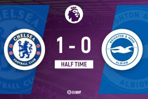 上半场伤停补时2分钟,半场结束,切尔西暂1-0布莱顿。
