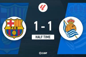 半场-巴萨近9成控球率暂1-1皇家社会 奥德里奥索拉破门孔德扳平