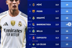 本赛季西甲创造机会榜:居勒尔21次居首,佩德里、姆巴佩在列