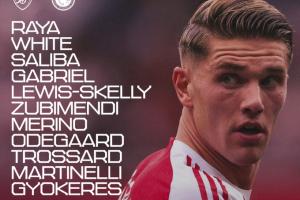 阿森纳vs纽卡首发:1-拉亚、3-莫斯克拉、6-加布里埃尔、12-廷伯、33-卡拉菲奥里、36-苏维门迪、41-赖斯、10-埃泽、7-萨卡、14-约克雷斯、19-特罗萨德
