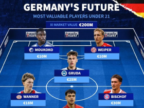 北京时间10月11日,德转列出了德国身价最高的U21球员阵容,亚历山大-帕夫洛维奇以5500万欧元的身价领衔,比朔夫、保罗-万纳、格鲁达以及穆科科在列。