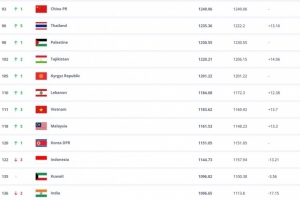 体育资讯10月17日讯 IFA更新最新一期国家队排名,亚足联国家队方面,国足积分不变,但排名从世界第94位升至世界第93位,亚洲排名则仍是第14位。