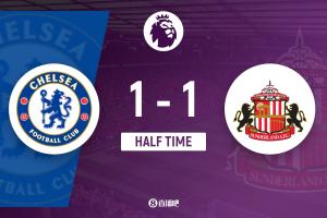 上半场伤停补时3分钟,半场结束,切尔西暂1-1桑德兰。