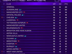 Squawka每周让粉丝投票选出最具争议的VAR判罚。去除了这些争议VAR判罚,英超前十轮的英超积分榜中,切尔西将积18分来到第五位,利物浦将同积18分排名第六。